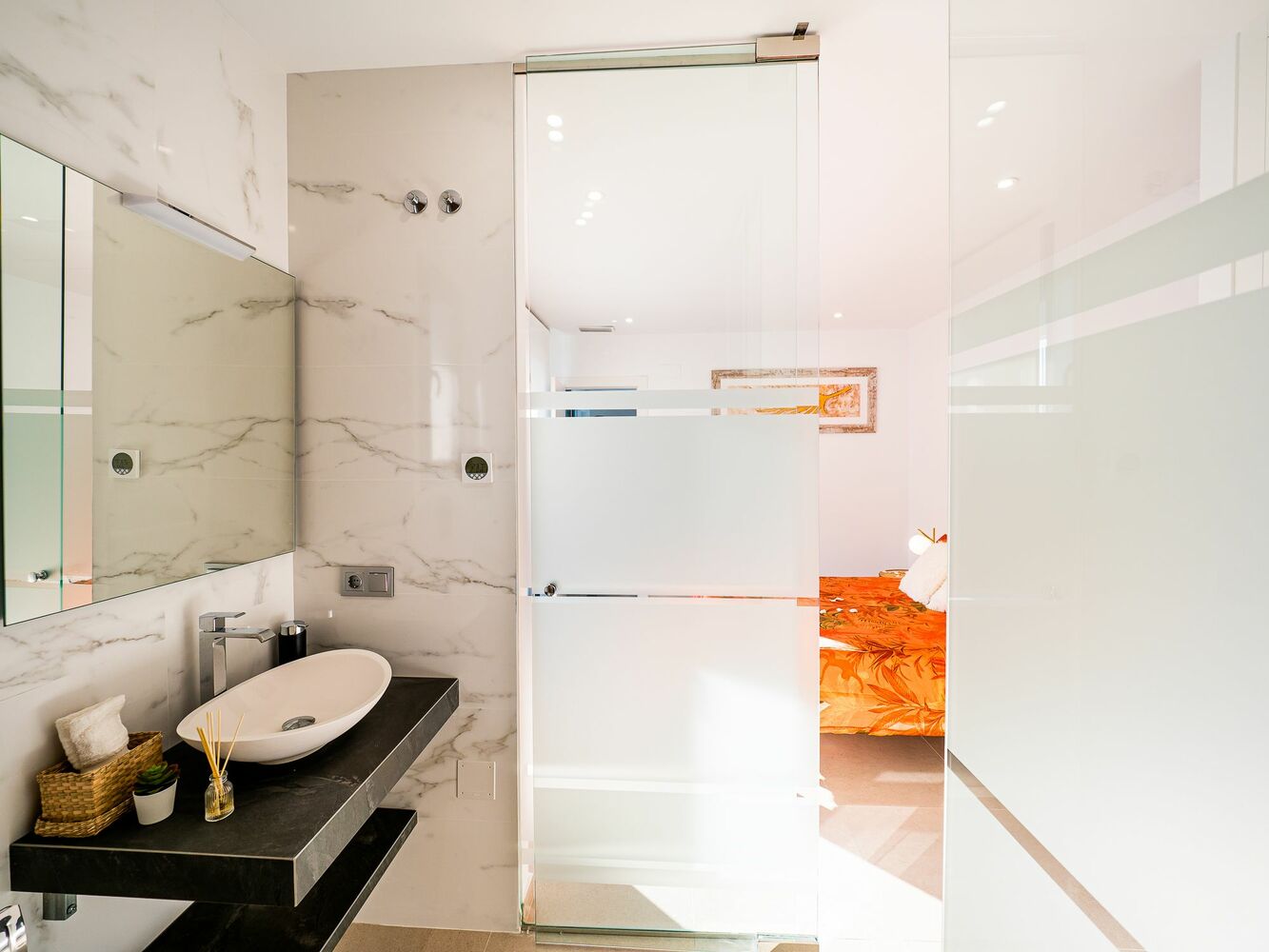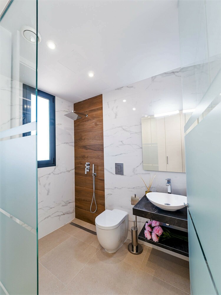 Deze, op golfresort gelegen vrijstaande Villa met 5 slaapkamers, 4 badkamers waarvan 3 en-suite zijn erg ruim en hebben door de ligging een prachtige lichtinval. De woningen met een oppervlakte van 198 m2 zijn voorzien van een woonkamer met een open keuken, vloerverwarming in de badkamers, een bijkeuken en een apart gastentoilet. Het gebruik van marmer voor de trap naar de 1e verdieping en in de badkamers is erg mooi in combinatie met de andere gebruikte materialen. Keukenapparatuur is bij deze woningen inclusief en is van een hoge kwaliteit. Daarnaast is er nog een volledig afgewerkt en ingedeeld basement met een woonkamer, een complete badkamer, 2 slaapkamers en een bergruimte. De tuin/terras aan de voor- achter en zijkant is compleet aangelegd en verlicht. Er is een zwembad van 6 x 3 meter en een buitendouche. Uiteraard heeft de woning een eigen oprit met een elektrisch bedienbare poort. Een solarium van 42 m2 is een optie.